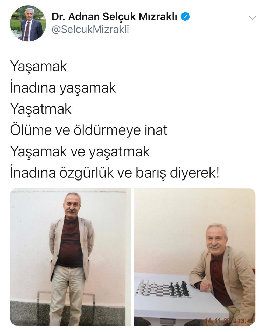 Kayseri Bünyan T2 Ceza İnfaz Kurumu’ndan Ses ve Görüntü Bilişim Sistemi (SEGBİS) aracılığıyla katıldı, Mızraklı, tutuklu bulunduğu cezaevinden çektirdiği fotoğrafları Twitter hesabında paylaştı. Mızraklı, fotoğrafları şu sözlerle paylaştı: “Yaşamak, inadına yaşamak, yaşatmak, ölüme ve öldürmeye inat yaşamak ve yaşatmak, inadına özgürlük ve inadına barış diyerek!”